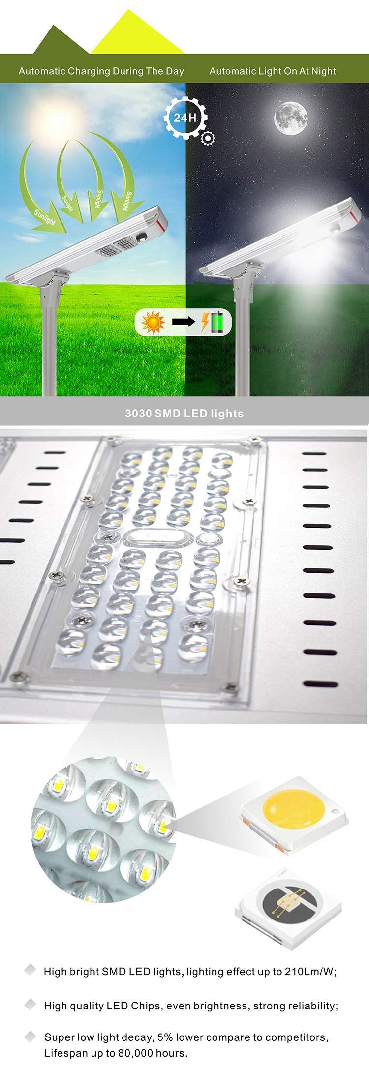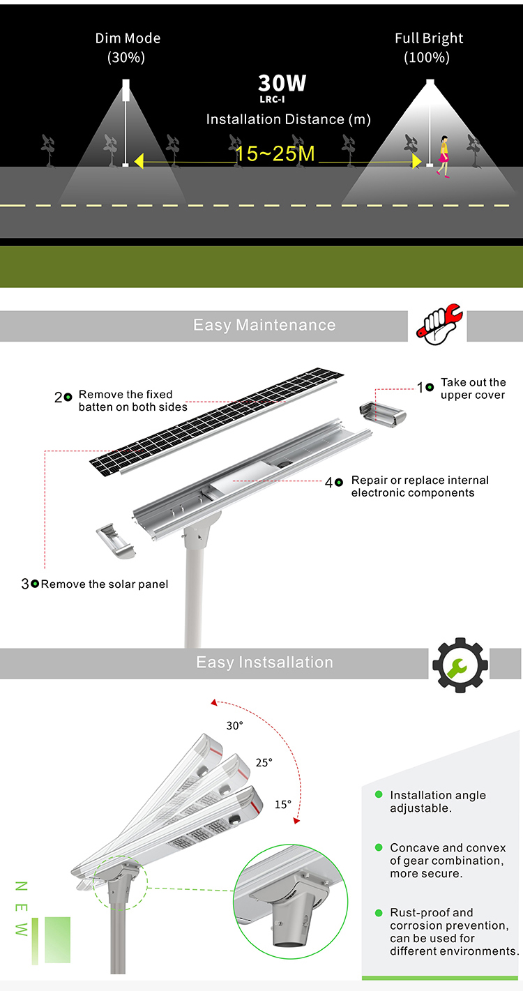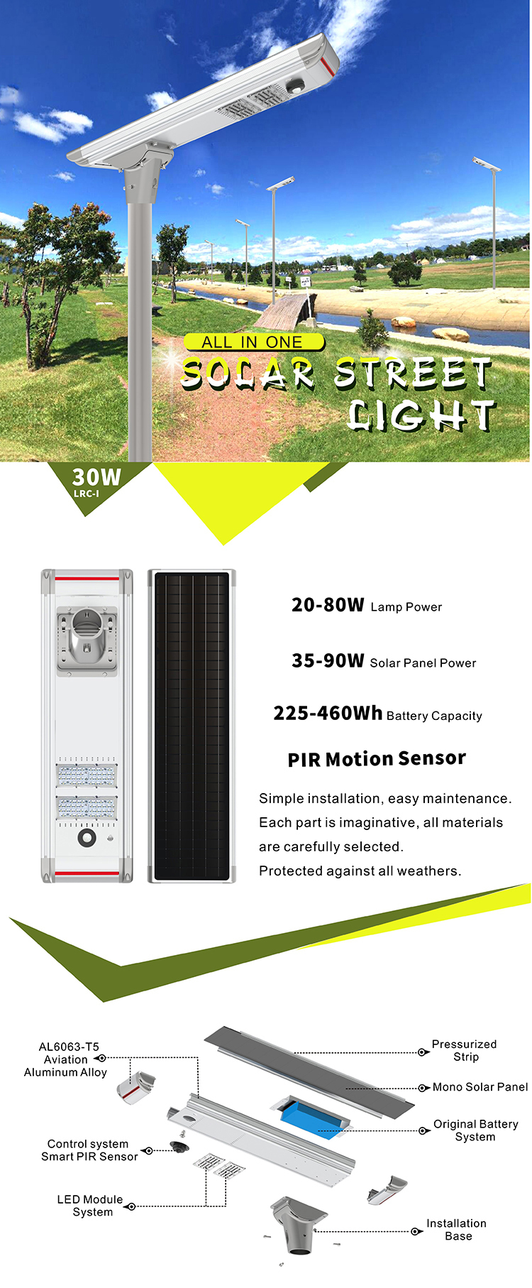 LRC-I30WFarola solar LED todo en uno con carcasa de aluminio OEM para exteriores, resistente al agua IP65, 20 W, 30 W, 40 W, 60 W y 80 W.